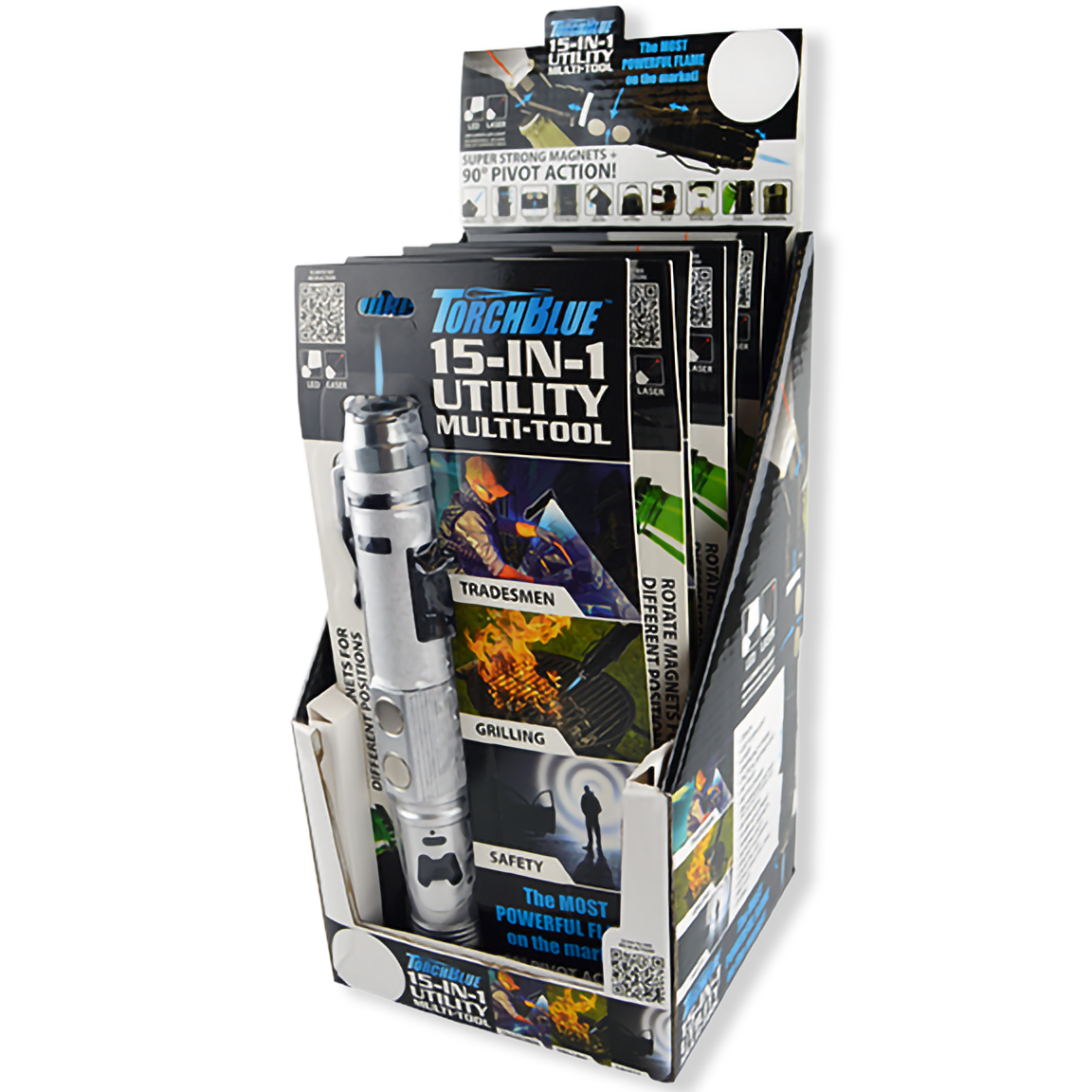 15-In-1 utility multi-tool. Made from durable aircraft aluminum. Has tons of features including 2300º torch flame that can work at any angle, LED light, laser light, pivot head, bottle opener, utility edge window breaker, and more!